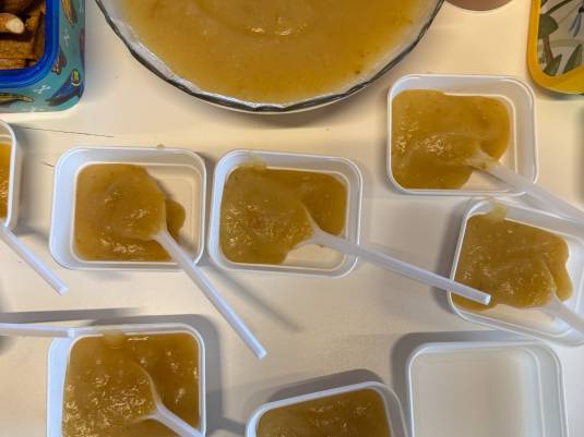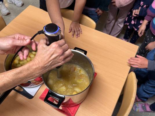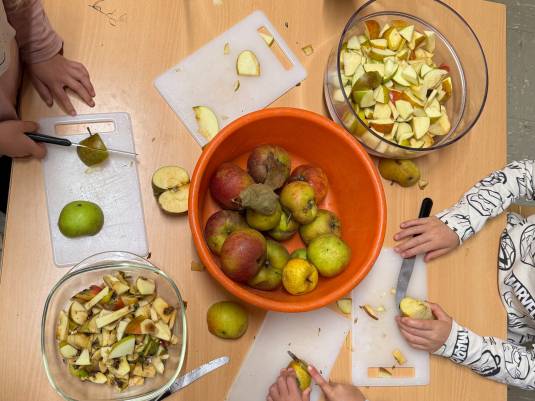 Im Garten des Kindergarten Römerweg steht ein Apfelbaum. Im Herbst lernen die Kinder jeweils die Teile des Baumes kennen. Dies durch spüren, benennen und einem passenden Lied. Nach dem eifrigen Sammeln der Äpfel wurden diese genau betrachtet und nach Farbe, Größe oder zum Kompostieren sortiert. Anschließend durften die Kinder in diesem Jahr die Äpfel in kleine Stücke schneiden und daraus ein leckeres Apfelmus kochen. Der ganze Kindergartenraum duftete danach wunderbar und die Kinder genossen es begeistert zum Znüni. Freundliche Grüsse und schöne Herbstferien Anne-Käthi