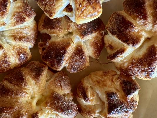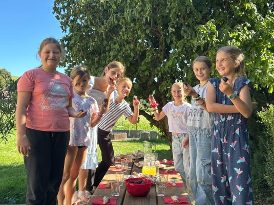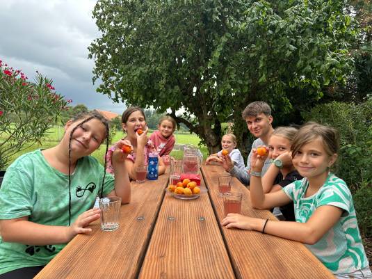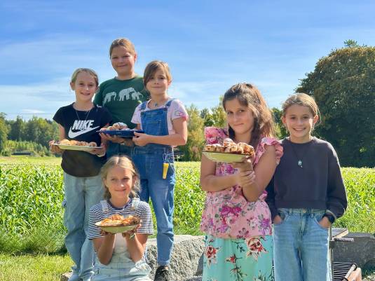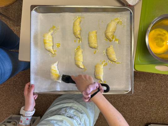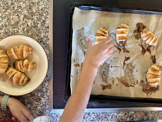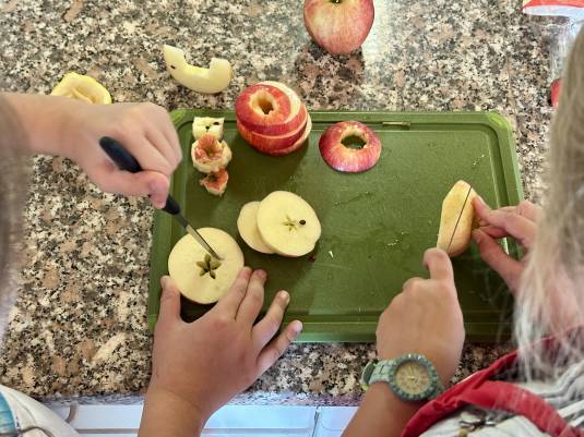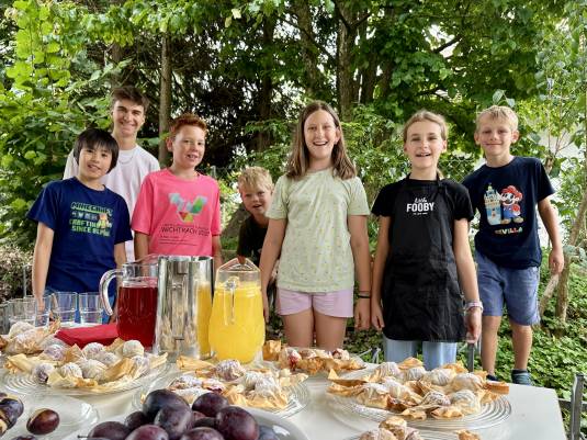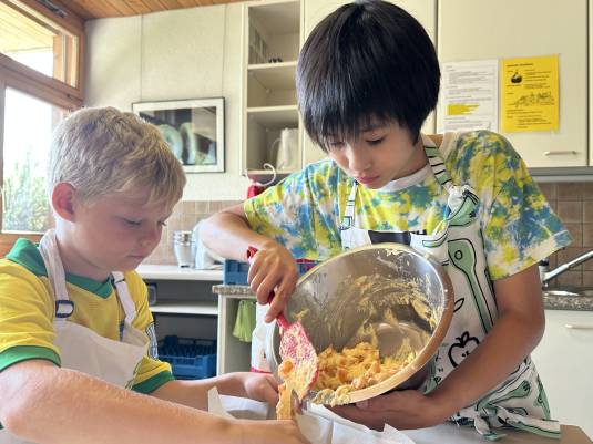 Ob Zwetschgen sorgfältig einwickeln, runde Kerngehäuse aus Apfelscheiben schneiden, Teig zu Croissants formen oder Bonbons aus Strudelteig falten – die Kinder tauchten neugierig in jede Backart ein und probierten gleich selber aus. Während im Ofen alles köstlich duftet, wird zusammen aufgeräumt. Und danach geniessen wir draussen im Gärtli unser feines, selbstgemachtes Zvieri.
