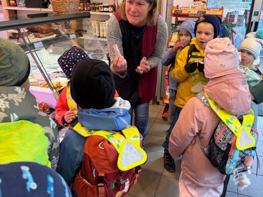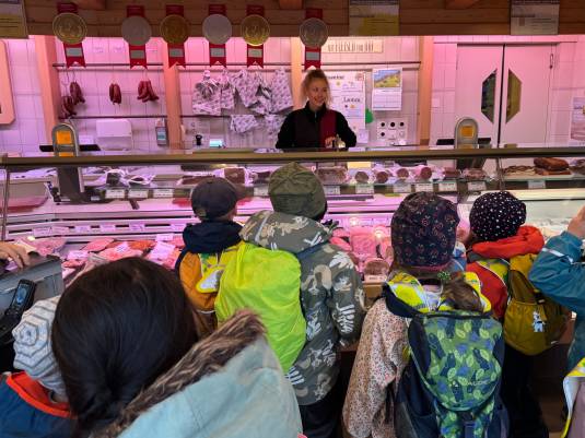 Zuerst besuchten wir die Landwirtin, danach gingen wir in die Gärtnerei, anschliessend erklärte uns der Sanitär etwas von seinen Arbeiten. Weiter kamen wir bei der Bäckerei, beim Zahnarzt und beim Coiffeur und Uhrmacher vorbei. Auf der anderen Seite der Strasse haben wir uns die Holzbau Firma und das Lager eines Malers angesehen. Näher beim Dorfzentrum waren wir bei der Metzgerei zu Gast, welche die Kinder mit einem Rädli Wurst verwöhnt hat. Gegenüber in der Drogerie wurden wir über einige Arbeiten in der Drogerie informiert. Alle Kinder bekamen ein Give-away-Säckli mit Traubenzucker. Spannend wurde es in der Bank, da wir sogar in den Tresorraum gehen konnten. Auch hier durften die Kinder aus einem grossen Korb ein Andenken auswählen. Zum Schluss haben wir das Restaurant besucht und die Berufe dort kennengelernt. Wir durften sogar in die Küche und dort wurde uns eine Süssigkeit auf den Weg mitgegeben. Am Ende des Rundganges standen wir bei der Schlosserei, aus Sicherheitsgründen blieben wir dort auf Abstand bei der Türe.